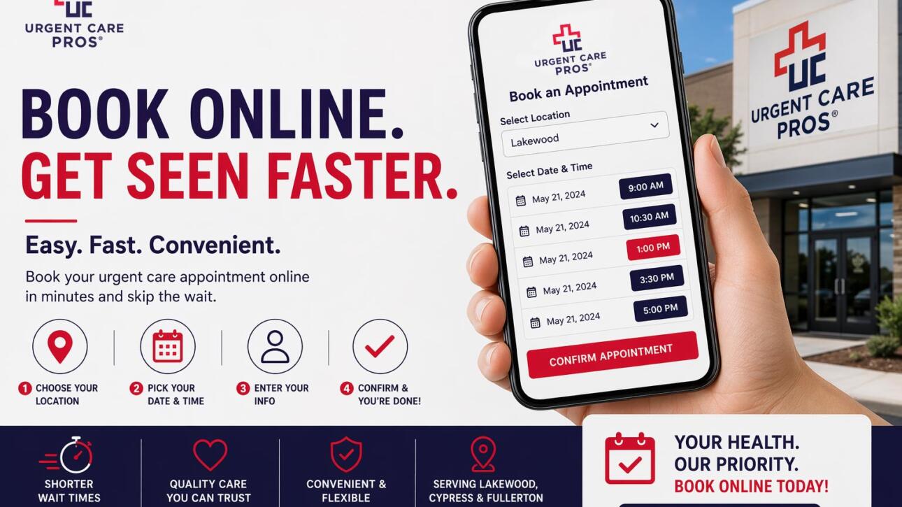 When you’re not feeling well, the last thing you want is to sit in a crowded waiting room or spend time on the phone trying to schedule an appointment. That’s why Urgent Care Pros makes online booking incredibly simple, fast, and stress-free.
